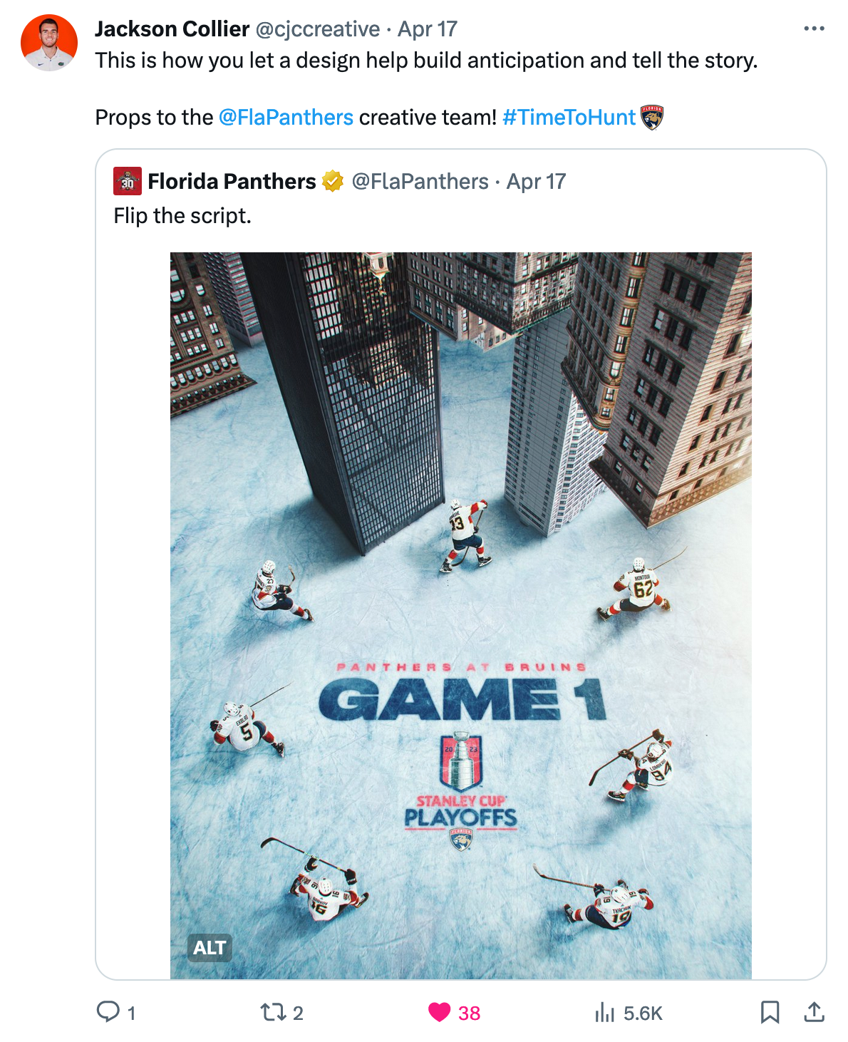 Role as Senior Graphic Designer for the Florida Panthers. Created "Hype" graphics to boost fan engagement around important season and playoff games. Graphics from Spring 2023 onwards. In reverse chronological order; most recent graphics towards the top.
